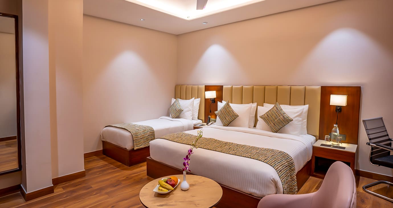 Offering 295 sq.ft (27 sq.m), the Deluxe Triple Room is ideal for groups, featuring a large and single bed for three guests. Pleasant interiors, comfortable seating, a work desk, and ambient lighting create a harmonious stay.