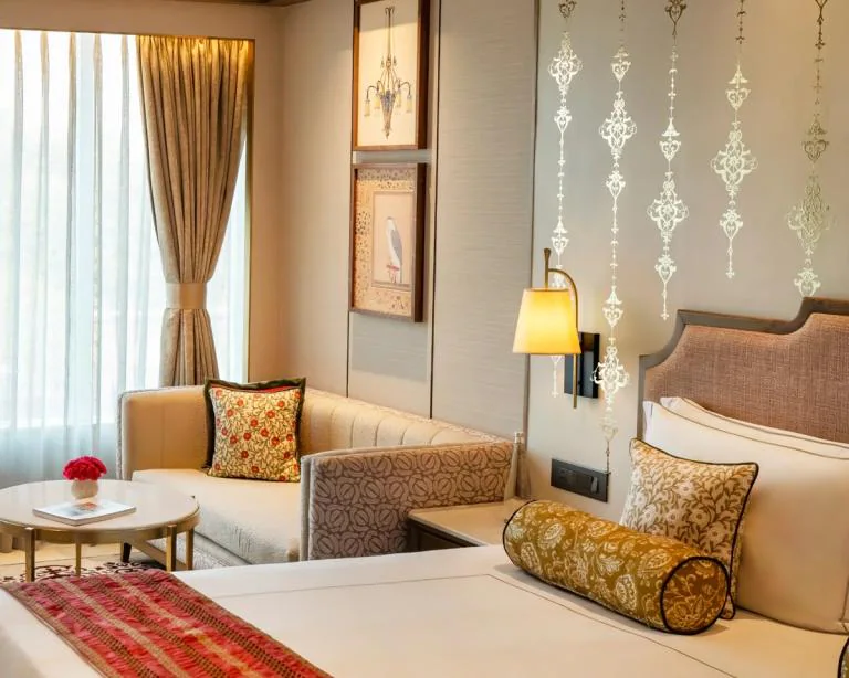 These luxurious rooms at Taj Agra feature elegant décor, stylish bathrooms, refined furnishings, and a calm ambience for a relaxing stay.