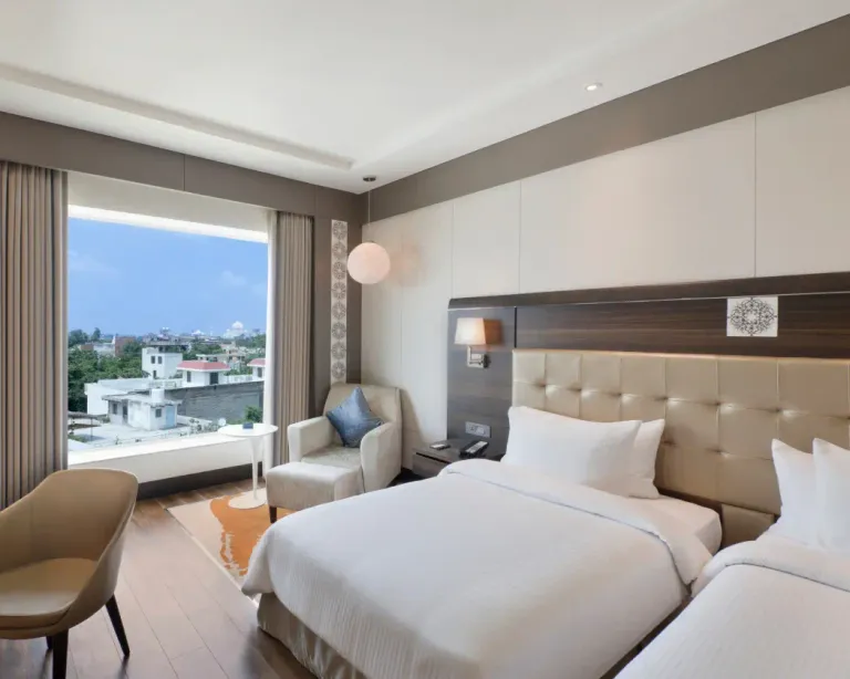 Indulge in the opulence of our Luxury Rooms at Taj Agra. Each room is a haven of modern elegance, featuring warm welcoming tones, rich textures, and sophisticated décor, all thoughtfully designed to provide a truly memorable stay experience.